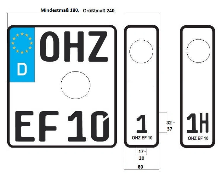 - Engschrift: Buchstaben 40,5 x 75 mm, Ziffern 38,5 x 75 mm (spart 7 mm pro Buchstabe und 6 mm pro Ziffer) - Motorradkennzeichen bis 04/2011 bei freundlicherer Zulassungsstelle